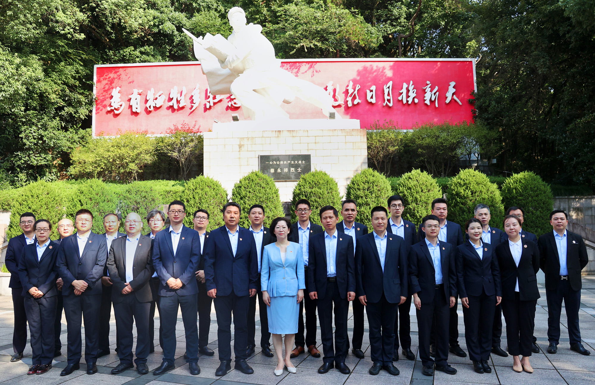 钱塘江畔大河滔滔,月轮山麓郁郁葱葱。杭州市革命烈士纪念馆前身是蔡永祥烈士事迹陈列馆,是杭州市目前唯一的综合性革命史迹和烈士事迹宣传阵地。此时正职盛夏三伏天,刘景萍董事长一行冒着酷暑,沿着馆内“Z”形步道登山,在馆外瞻仰了蔡永祥烈士纪念雕像,学习了蔡永祥烈士舍身救列车的光辉感人事迹。