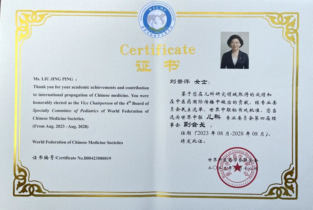 fun88乐天堂药业集团党委书记、董事长刘景萍当选世界中医药学会联合会儿科专业委员会第四届理事会副会长